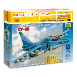 Набор деталей для сборки модели, клей, кисточка и четыре краски (черная, белая, голубая, светло-голубая).
