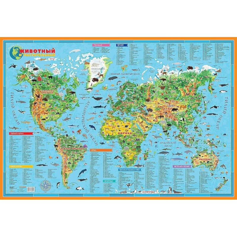На карте представлены флора и фауна материков нашей планеты, а также животные Мирового океана. Надеемся, что многообразие видов вызовет интерес к школьному предмету 'Биология'.