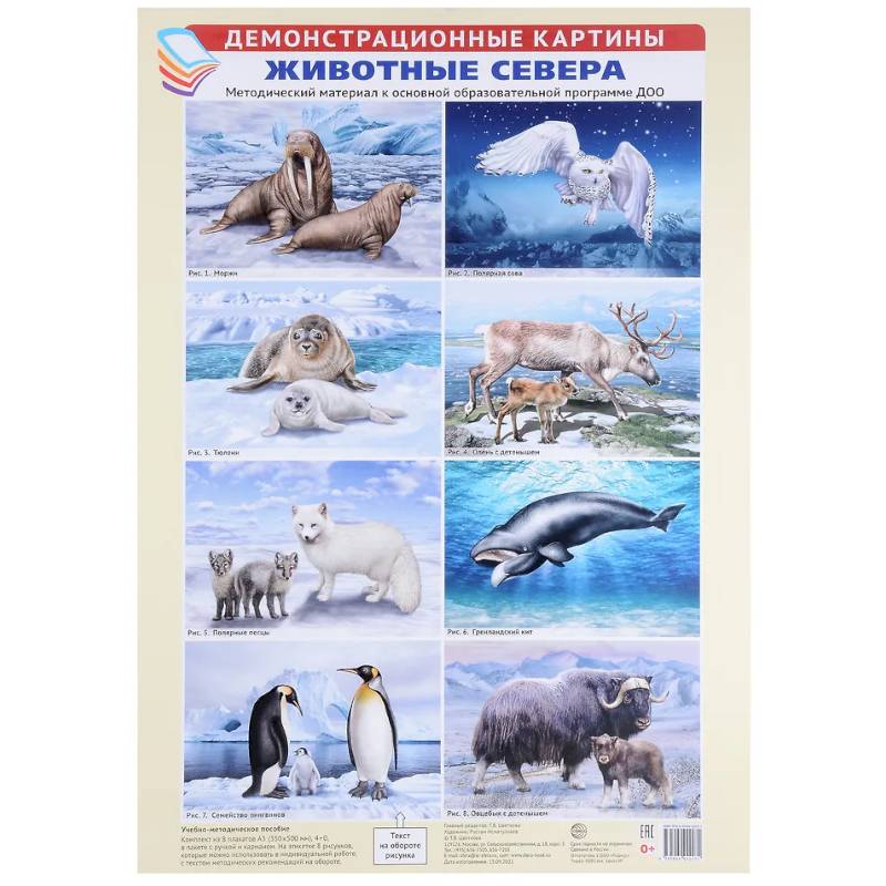 Издательство «ТЦ Сфера» представляет комплект «Животные Севера», состоящий из 8 цветных демонстрационных картин формата А3 и этикетки, на обороте которой приводятся беседы, занятия и упражнения с детьми по каждой картине. Дети познакомятся с животными Севера — моржами, тюленями, полярными песцами, северными оленями, императорскими пингвинами, полярными совами, овцебыками и гренландскими китами. Узнают о них много новой полезной информации, отгадают загадки, ответят на вопросы воспитателя (педагога), научатся составлять описательный рассказ, сыграют в дидактические, подвижные и познавательные игры по теме. Комплект подходит для индивидуальной и групповой работы, может использоваться на тематических викторинах и вечерах, посвященных животным Севера.