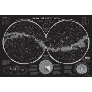 На этой необычной настенной карте размером 870х580 мм представлены северное и южное полушария небесной сферы. Так ночное небо с мерцающими на нём галактиками, туманностями и звёздными скоплениями выглядит с Северного и Южного полюсов Земли.