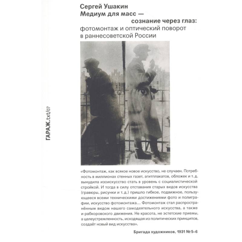 Эта книга о том, как фотомонтаж стал одним из самых востребованных жанров в середине 1920-х. Соединив в себе документальность (фотографии) и артистизм (фотомонтера), он предложил новый взгляд на реальность: взгляд, в котором разно-родность вещей усиливалась их разно-видностью. Используя фотомонтаж в качестве основного примера, книга показывает, как в первые 15 лет после Октябрьской революции формировалась новая «культура глаза» и новый оптический режим.