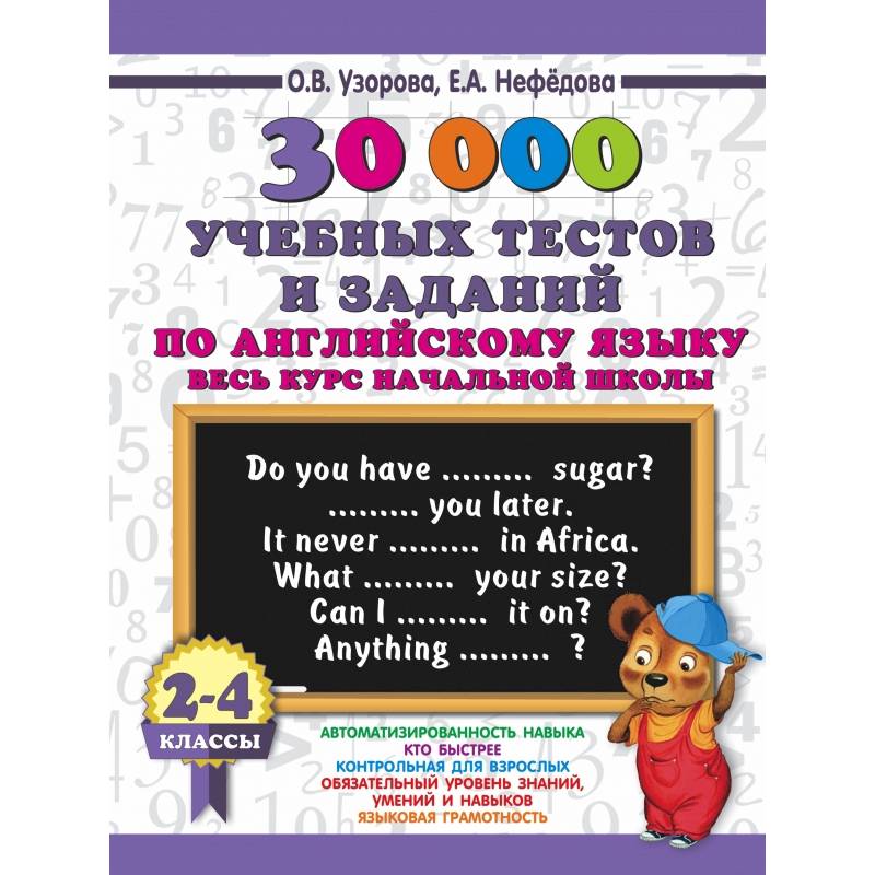 В издание входят 30 000 заданий на закрепление знаний английского языка за курс начальной школы (2-4 классы). Задания отличаются большим разнообразием (вставь пропущенное слово, реши тест, найди ошибку, закончи диалог) и охватывают все аспекты изучения иностранного языка: лексику, грамматику, синтаксис, различия между британским и американским вариантами. Издание структурировано по тематике уроков таким образом, что позволяет учащимся за короткое время проверить свои знания, а учителю — проконтролировать их. Для облегчения проверки на каждой странице приведены контрольные цифры: идеальное время выполнения, удовлетворительное и результат, который должен заставить ученика задуматься. Пособие можно использовать в качестве дополнительного материала на уроках английского языка, а также для работы дома.