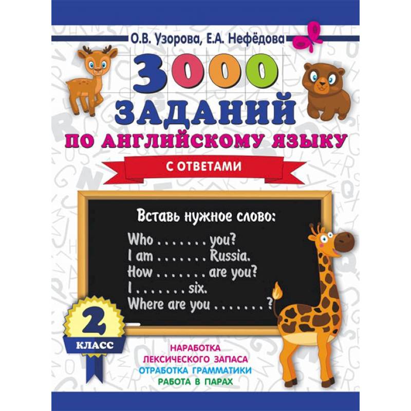 Книга '3000 заданий по английскому языку. 2 класс' написана известными педагогами-практиками О. В. Узоровой и Е. А. Нефёдовой, авторами более 700 учебных пособий для начальной школы. Материал пособия соответствует ФГОС и программе обучения английскому языку во 2 классе и даёт возможность ученикам быстро проверить свои знания по английскому языку. Учителя и родители могут отметить время, которое ребёнок затратил на выполнение заданий. На каждой странице дано контрольное время.