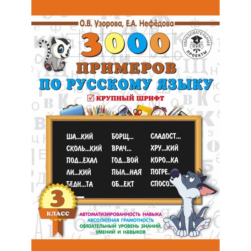 Пособие содержит 3000  новых примеров на повторение и закрепление основных правил орфографии и пунктуации. Оно охватывает всю программу 3 класса по русскому языку. Особенностью этого издания является крупный шрифт.